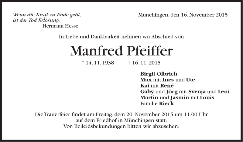 Hier finden Sie alle Traueranzeigen aus der Zeitung, die bisher für Manfred Pfeiffer erschienen sind. Weitere Traueranzeigen, die in der Zeitung erscheinen, werden hier ebenfalls aufgelistet