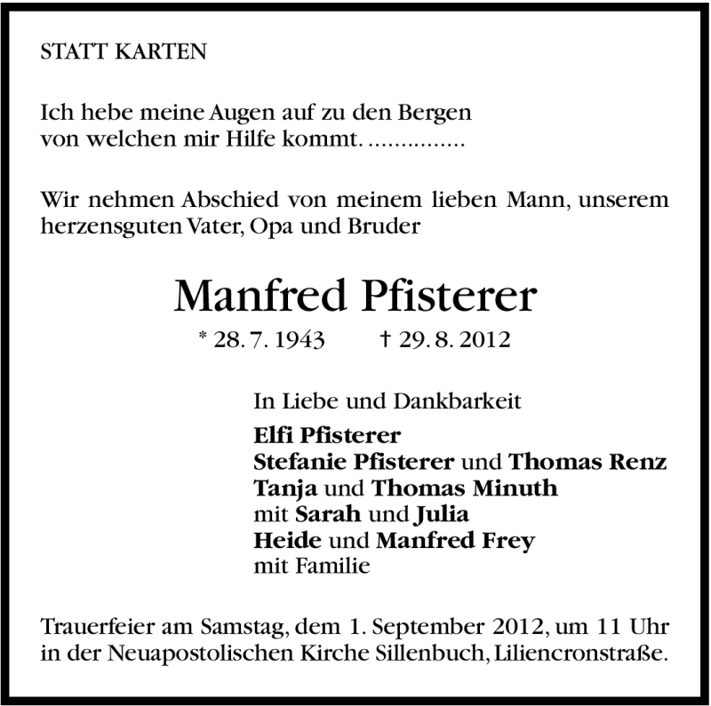 Hier finden Sie alle Traueranzeigen aus der Zeitung, die bisher für Manfred Pfisterer erschienen sind. Weitere Traueranzeigen, die in der Zeitung erscheinen, werden hier ebenfalls aufgelistet