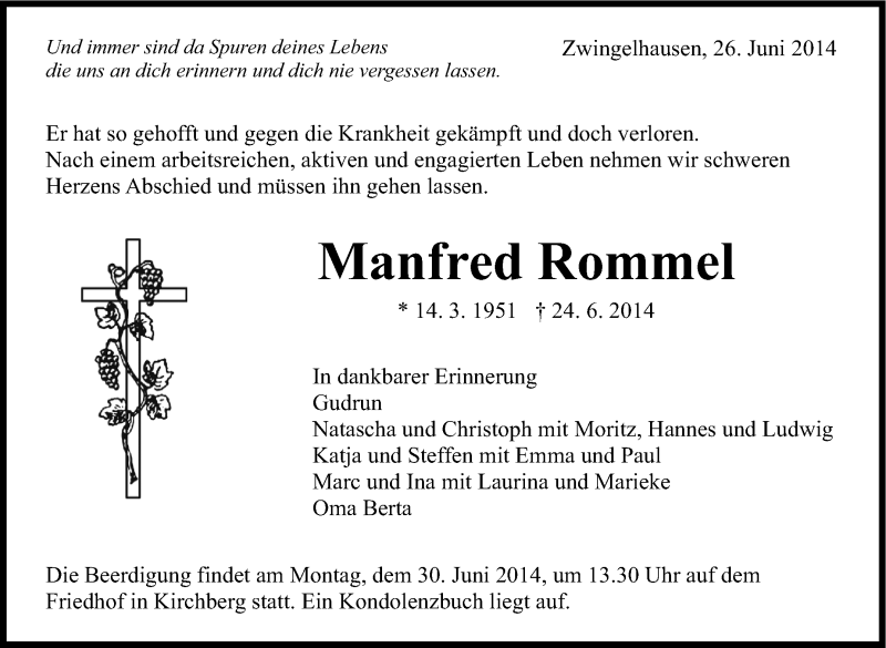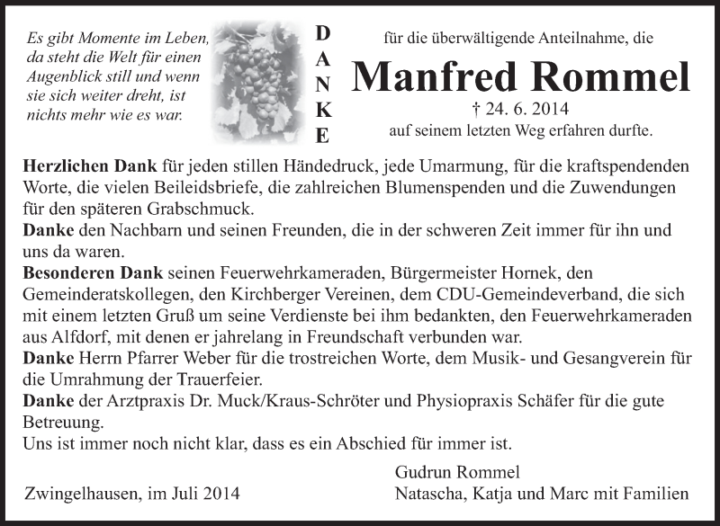 Hier finden Sie alle Traueranzeigen aus der Zeitung, die bisher für Manfred Rommel erschienen sind. Weitere Traueranzeigen, die in der Zeitung erscheinen, werden hier ebenfalls aufgelistet