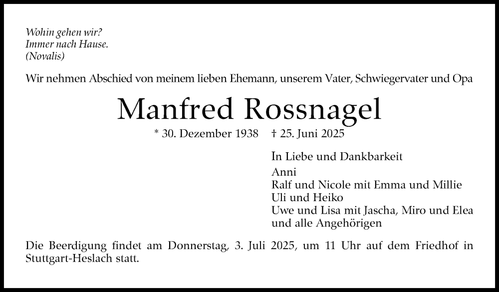 Hier finden Sie alle Traueranzeigen aus der Zeitung, die bisher für Manfred Rossnagel erschienen sind. Weitere Traueranzeigen, die in der Zeitung erscheinen, werden hier ebenfalls aufgelistet