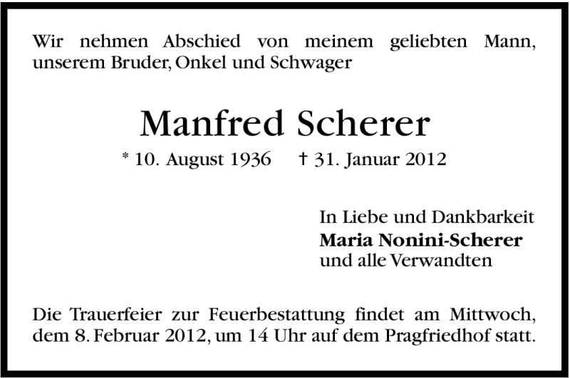 Hier finden Sie alle Traueranzeigen aus der Zeitung, die bisher für Manfred Scherer erschienen sind. Weitere Traueranzeigen, die in der Zeitung erscheinen, werden hier ebenfalls aufgelistet