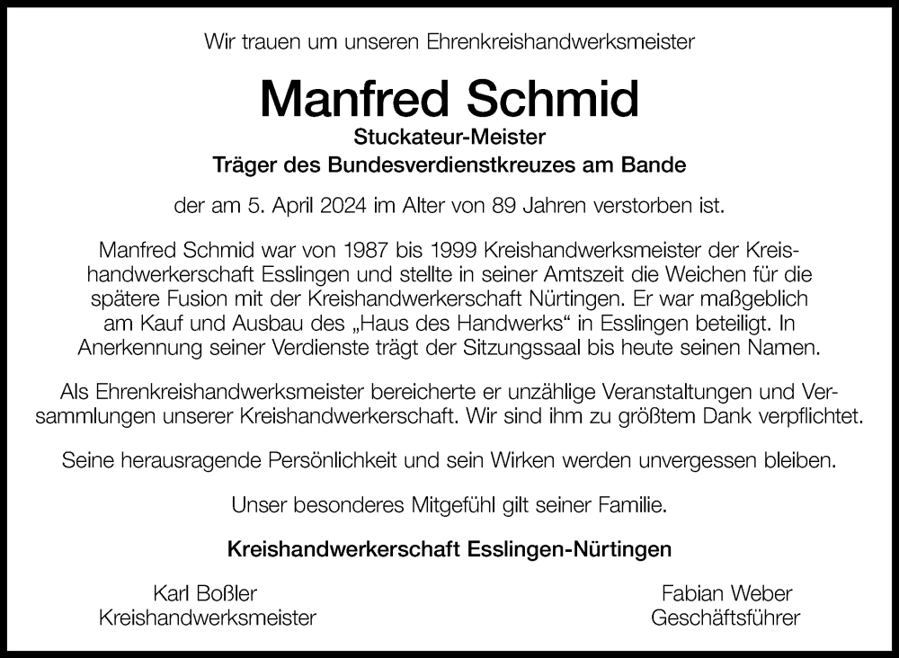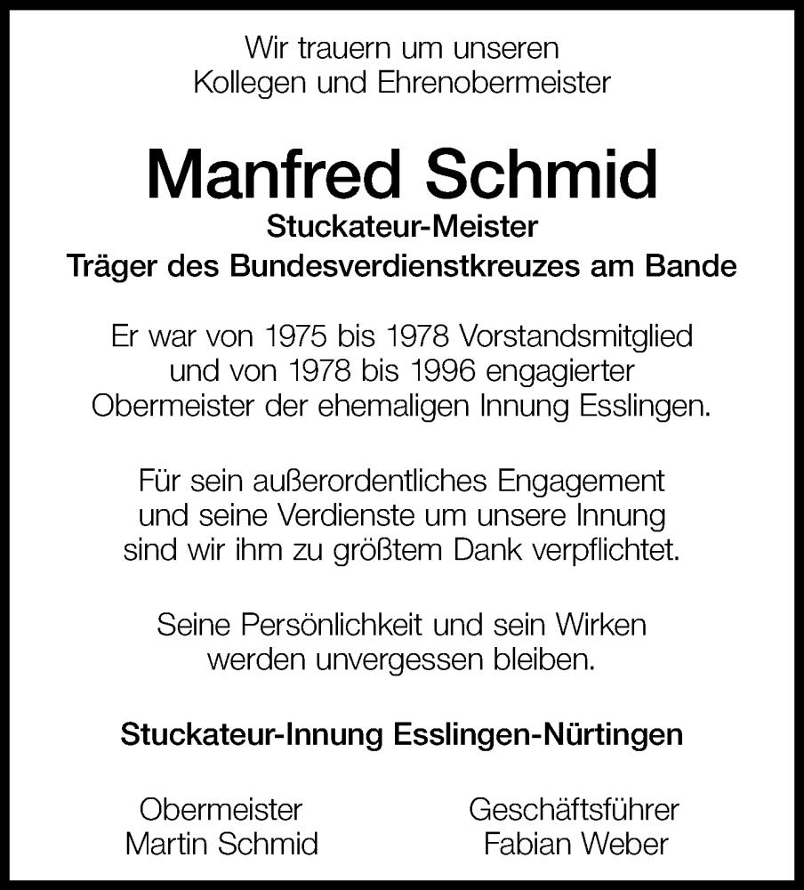 Hier finden Sie alle Traueranzeigen aus der Zeitung, die bisher für Manfred Schmid erschienen sind. Weitere Traueranzeigen, die in der Zeitung erscheinen, werden hier ebenfalls aufgelistet