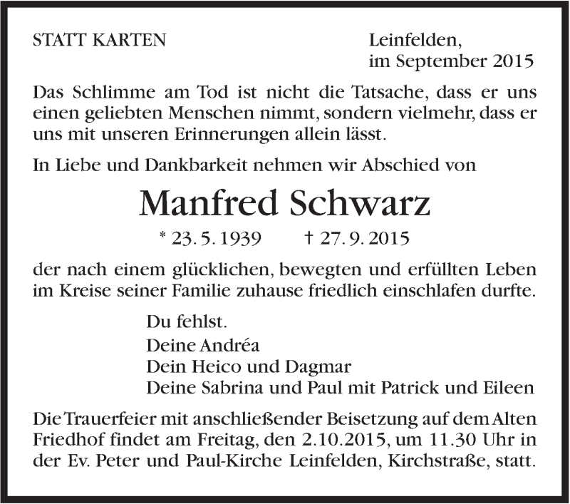 Hier finden Sie alle Traueranzeigen aus der Zeitung, die bisher für Manfred Schwarz erschienen sind. Weitere Traueranzeigen, die in der Zeitung erscheinen, werden hier ebenfalls aufgelistet