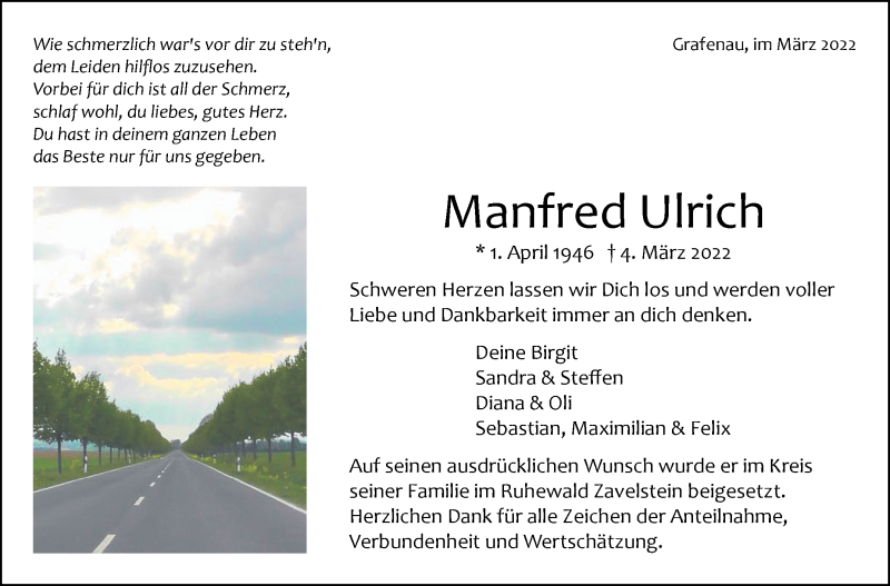 Hier finden Sie alle Traueranzeigen aus der Zeitung, die bisher für Manfred Ulrich erschienen sind. Weitere Traueranzeigen, die in der Zeitung erscheinen, werden hier ebenfalls aufgelistet