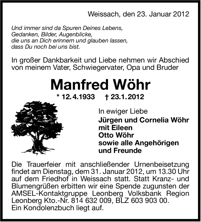 Hier finden Sie alle Traueranzeigen aus der Zeitung, die bisher für Manfred Wöhr erschienen sind. Weitere Traueranzeigen, die in der Zeitung erscheinen, werden hier ebenfalls aufgelistet