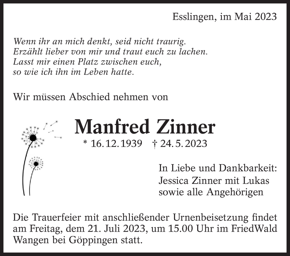 Hier finden Sie alle Traueranzeigen aus der Zeitung, die bisher für Manfred Zinner erschienen sind. Weitere Traueranzeigen, die in der Zeitung erscheinen, werden hier ebenfalls aufgelistet