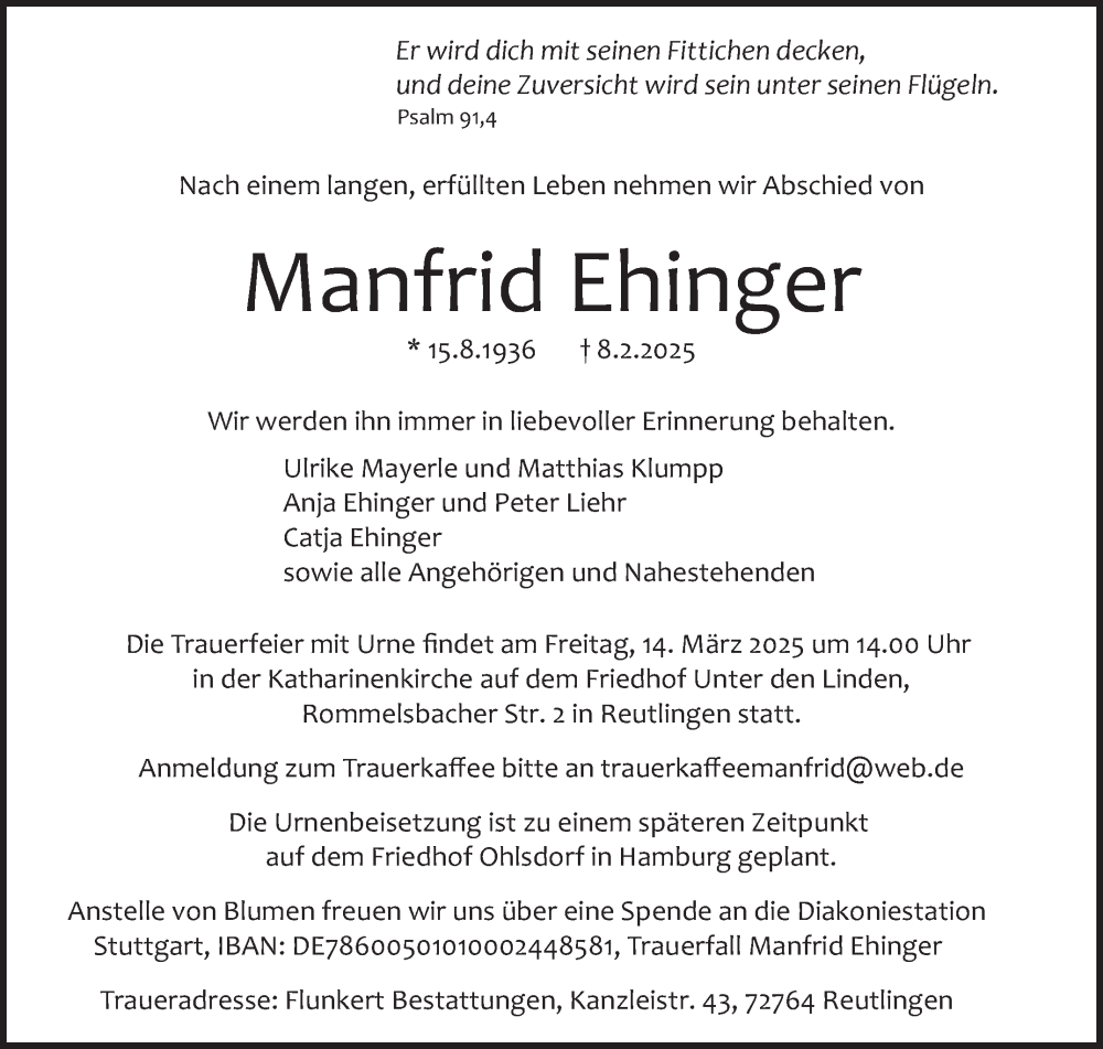 Hier finden Sie alle Traueranzeigen aus der Zeitung, die bisher für Manfrid Ehinger erschienen sind. Weitere Traueranzeigen, die in der Zeitung erscheinen, werden hier ebenfalls aufgelistet