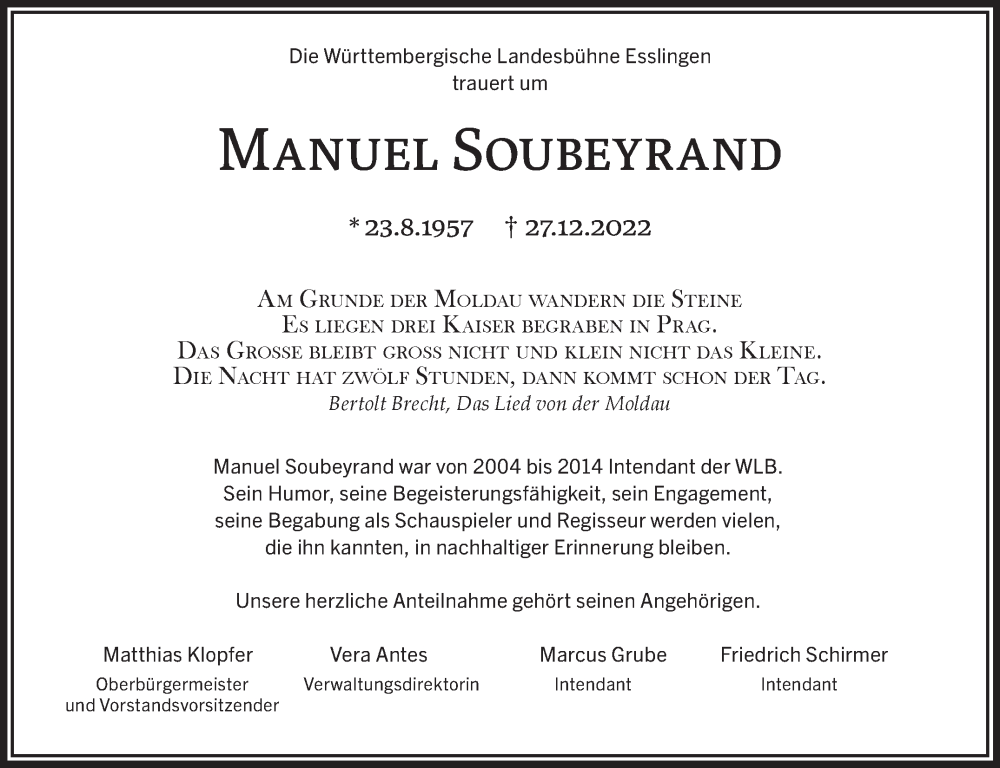 Hier finden Sie alle Traueranzeigen aus der Zeitung, die bisher für Manuel Soubeyrand erschienen sind. Weitere Traueranzeigen, die in der Zeitung erscheinen, werden hier ebenfalls aufgelistet