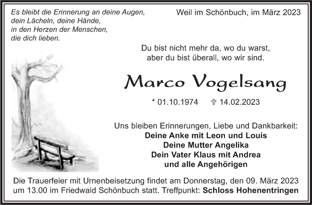 Hier finden Sie alle Traueranzeigen aus der Zeitung, die bisher für Marco Vogelsang erschienen sind. Weitere Traueranzeigen, die in der Zeitung erscheinen, werden hier ebenfalls aufgelistet
