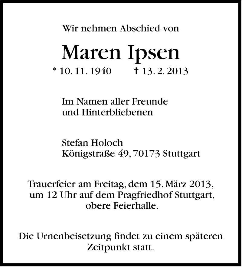 Hier finden Sie alle Traueranzeigen aus der Zeitung, die bisher für Maren Ipsen erschienen sind. Weitere Traueranzeigen, die in der Zeitung erscheinen, werden hier ebenfalls aufgelistet
