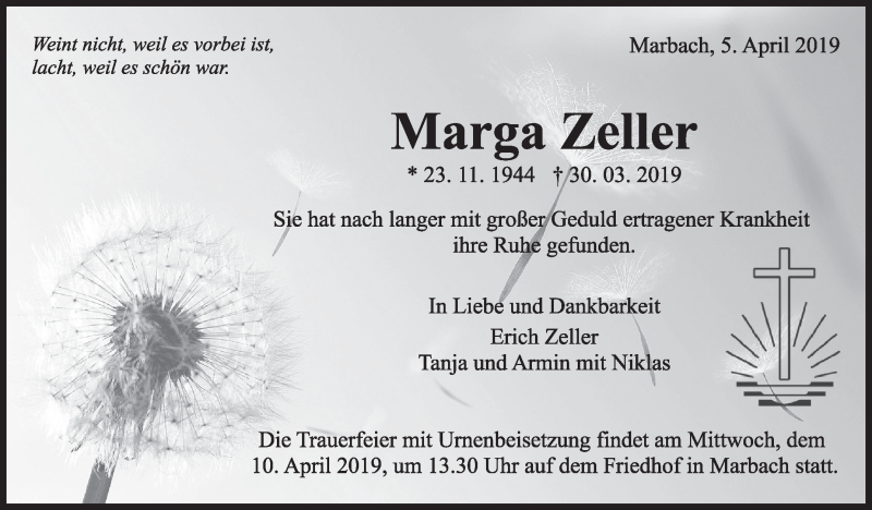Hier finden Sie alle Traueranzeigen aus der Zeitung, die bisher für Marga Zeller erschienen sind. Weitere Traueranzeigen, die in der Zeitung erscheinen, werden hier ebenfalls aufgelistet