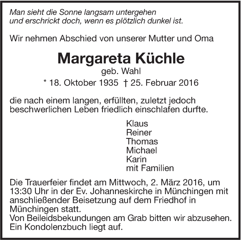 Hier finden Sie alle Traueranzeigen aus der Zeitung, die bisher für Margareta Küchle erschienen sind. Weitere Traueranzeigen, die in der Zeitung erscheinen, werden hier ebenfalls aufgelistet
