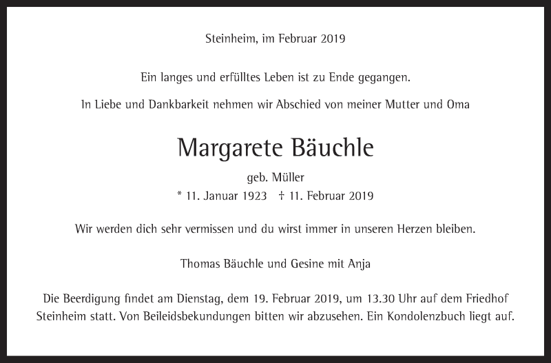 Hier finden Sie alle Traueranzeigen aus der Zeitung, die bisher für Margarete Bäuchle erschienen sind. Weitere Traueranzeigen, die in der Zeitung erscheinen, werden hier ebenfalls aufgelistet