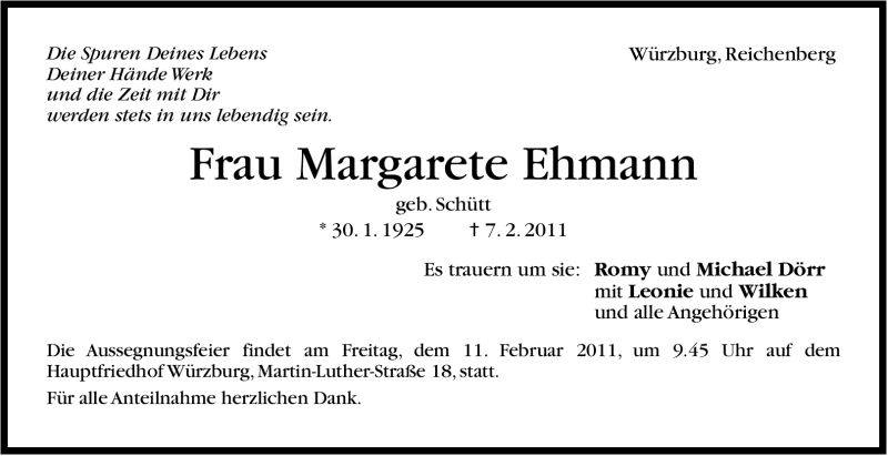 Hier finden Sie alle Traueranzeigen aus der Zeitung, die bisher für Margarete Ehmann erschienen sind. Weitere Traueranzeigen, die in der Zeitung erscheinen, werden hier ebenfalls aufgelistet