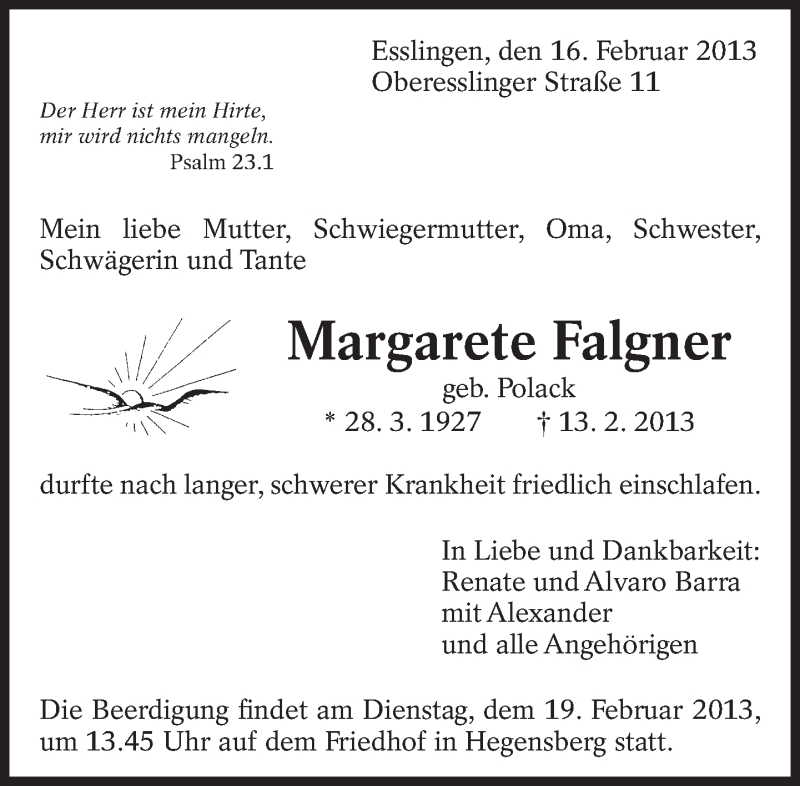Hier finden Sie alle Traueranzeigen aus der Zeitung, die bisher für Margarete Falgner erschienen sind. Weitere Traueranzeigen, die in der Zeitung erscheinen, werden hier ebenfalls aufgelistet