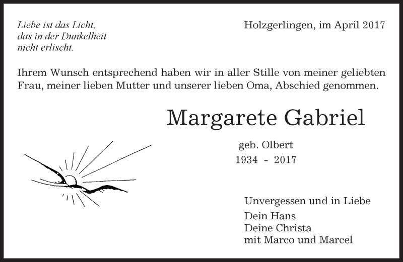 Hier finden Sie alle Traueranzeigen aus der Zeitung, die bisher für Margarete Gabriel erschienen sind. Weitere Traueranzeigen, die in der Zeitung erscheinen, werden hier ebenfalls aufgelistet