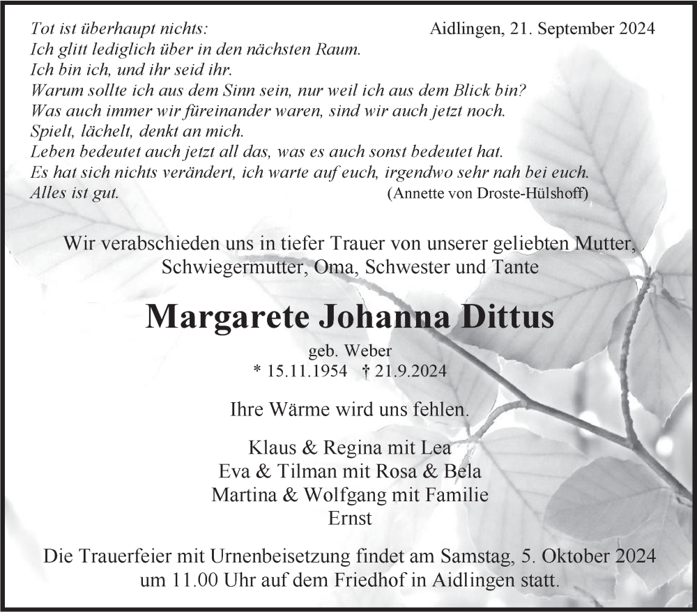 Hier finden Sie alle Traueranzeigen aus der Zeitung, die bisher für Margarete Johanna Dittus erschienen sind. Weitere Traueranzeigen, die in der Zeitung erscheinen, werden hier ebenfalls aufgelistet