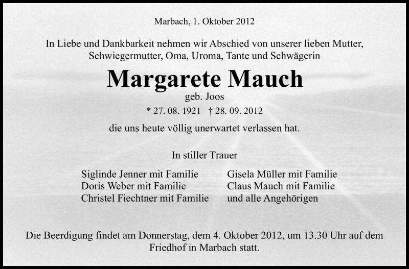 Hier finden Sie alle Traueranzeigen aus der Zeitung, die bisher für Margarete Mauch erschienen sind. Weitere Traueranzeigen, die in der Zeitung erscheinen, werden hier ebenfalls aufgelistet