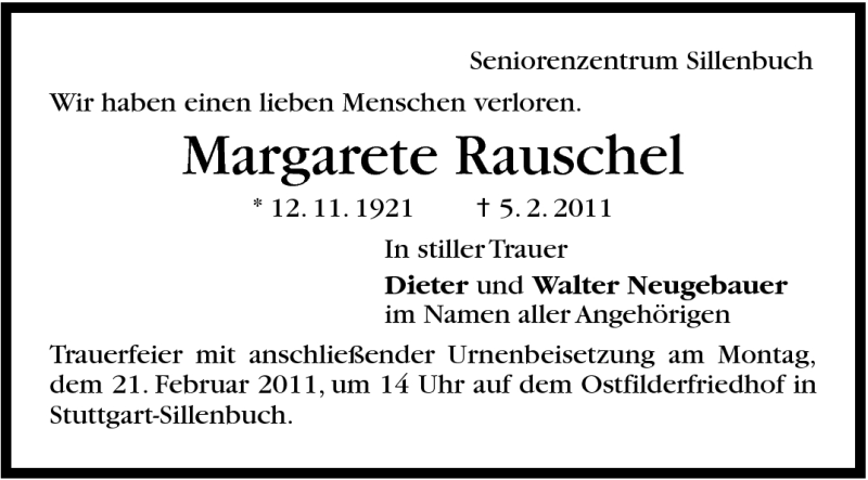 Hier finden Sie alle Traueranzeigen aus der Zeitung, die bisher für Margarete Rauschel erschienen sind. Weitere Traueranzeigen, die in der Zeitung erscheinen, werden hier ebenfalls aufgelistet