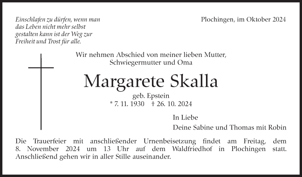 Hier finden Sie alle Traueranzeigen aus der Zeitung, die bisher für Margarete Skalla erschienen sind. Weitere Traueranzeigen, die in der Zeitung erscheinen, werden hier ebenfalls aufgelistet
