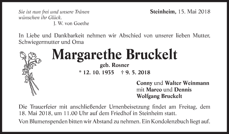 Hier finden Sie alle Traueranzeigen aus der Zeitung, die bisher für Margarethe Bruckelt erschienen sind. Weitere Traueranzeigen, die in der Zeitung erscheinen, werden hier ebenfalls aufgelistet