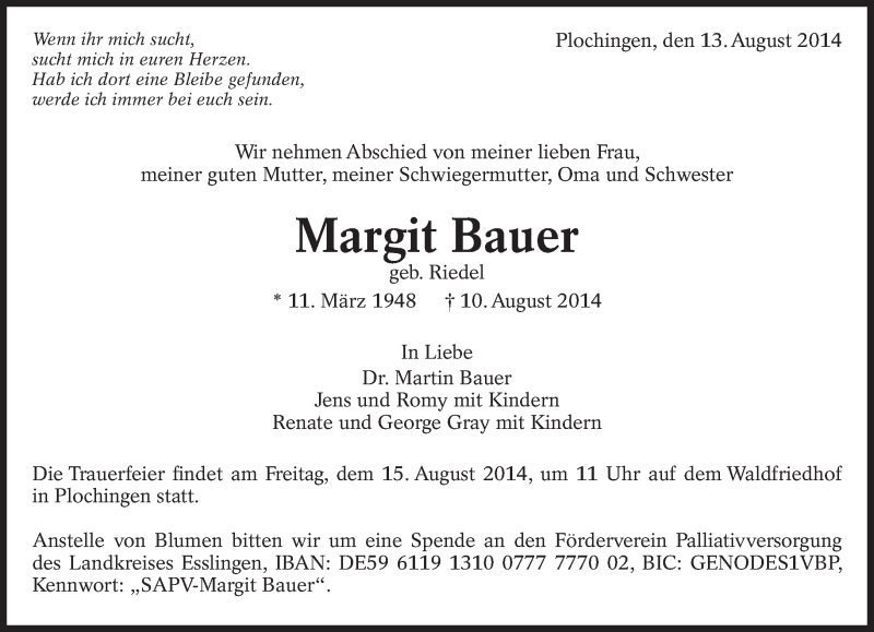 Hier finden Sie alle Traueranzeigen aus der Zeitung, die bisher für Margit Bauer erschienen sind. Weitere Traueranzeigen, die in der Zeitung erscheinen, werden hier ebenfalls aufgelistet