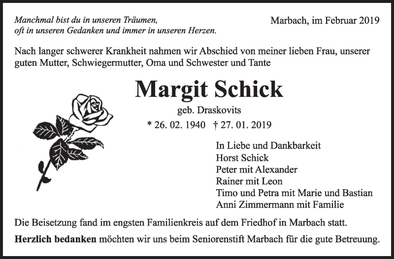 Hier finden Sie alle Traueranzeigen aus der Zeitung, die bisher für Margit Schick erschienen sind. Weitere Traueranzeigen, die in der Zeitung erscheinen, werden hier ebenfalls aufgelistet