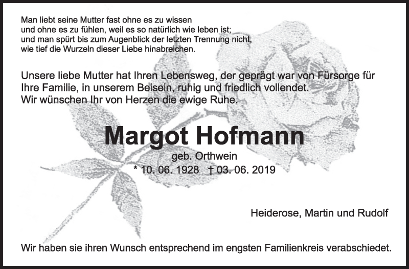 Hier finden Sie alle Traueranzeigen aus der Zeitung, die bisher für Margot Hofmann erschienen sind. Weitere Traueranzeigen, die in der Zeitung erscheinen, werden hier ebenfalls aufgelistet
