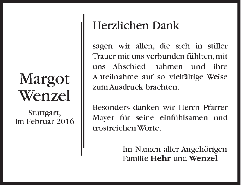 Hier finden Sie alle Traueranzeigen aus der Zeitung, die bisher für Margot Wenzel erschienen sind. Weitere Traueranzeigen, die in der Zeitung erscheinen, werden hier ebenfalls aufgelistet