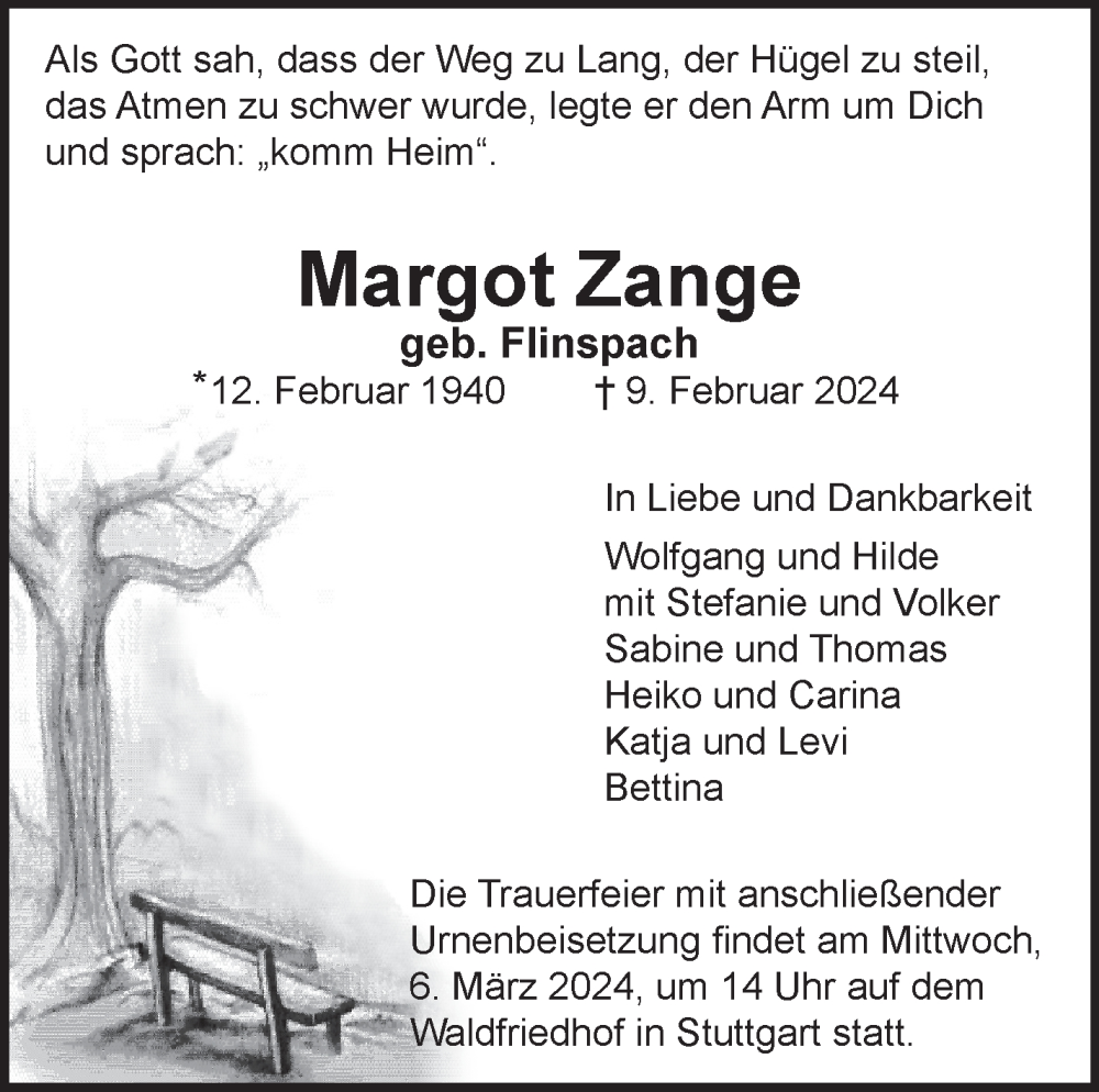 Hier finden Sie alle Traueranzeigen aus der Zeitung, die bisher für Margot Zange erschienen sind. Weitere Traueranzeigen, die in der Zeitung erscheinen, werden hier ebenfalls aufgelistet