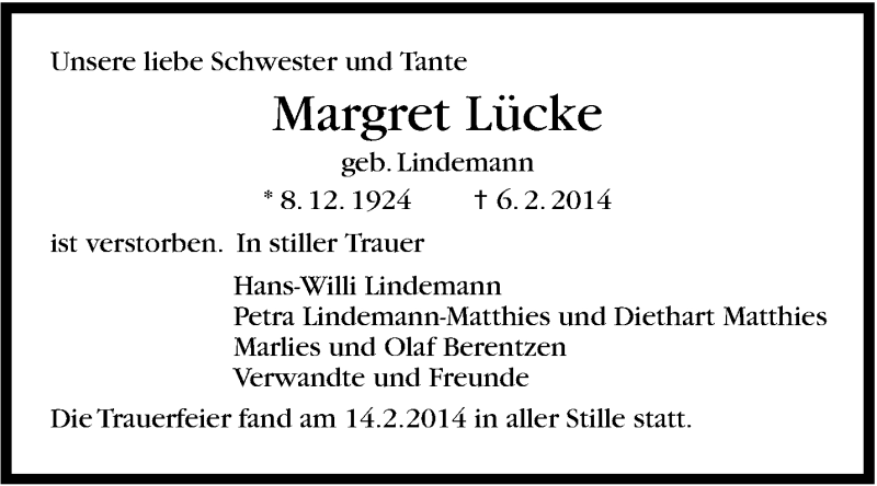 Hier finden Sie alle Traueranzeigen aus der Zeitung, die bisher für Margret Lücke erschienen sind. Weitere Traueranzeigen, die in der Zeitung erscheinen, werden hier ebenfalls aufgelistet