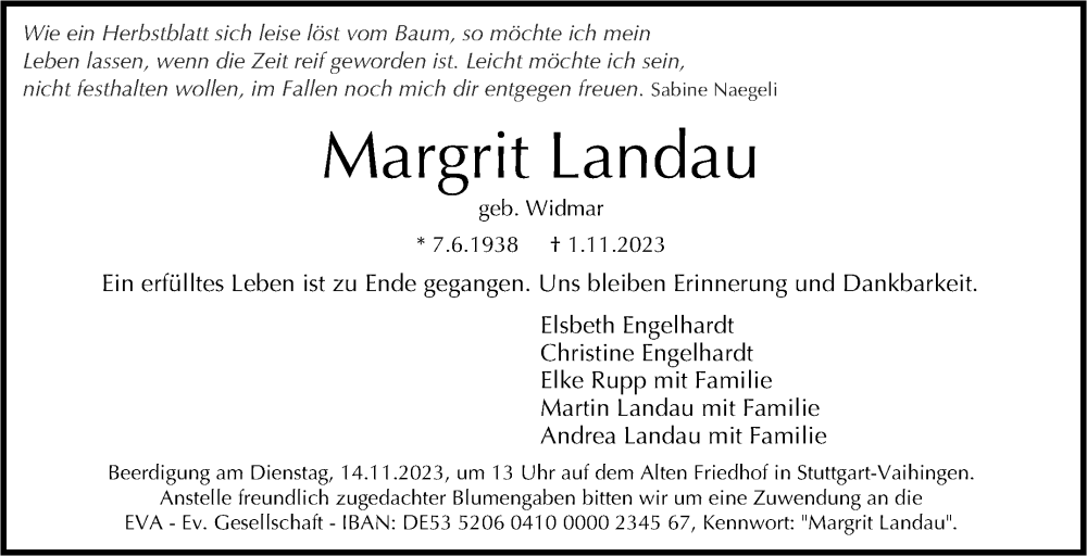 Hier finden Sie alle Traueranzeigen aus der Zeitung, die bisher für Margrit Landau erschienen sind. Weitere Traueranzeigen, die in der Zeitung erscheinen, werden hier ebenfalls aufgelistet