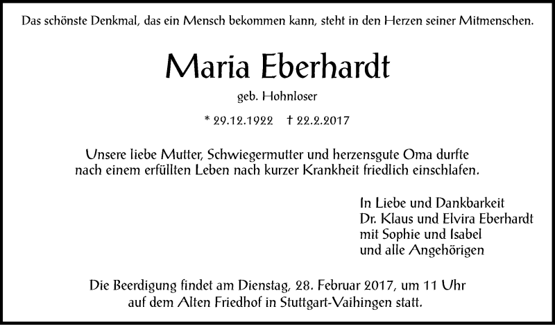 Hier finden Sie alle Traueranzeigen aus der Zeitung, die bisher für Maria Eberhardt erschienen sind. Weitere Traueranzeigen, die in der Zeitung erscheinen, werden hier ebenfalls aufgelistet