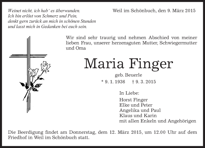Hier finden Sie alle Traueranzeigen aus der Zeitung, die bisher für Maria Finger erschienen sind. Weitere Traueranzeigen, die in der Zeitung erscheinen, werden hier ebenfalls aufgelistet