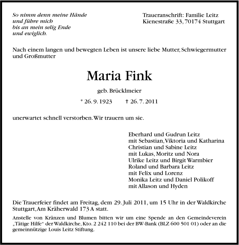 Hier finden Sie alle Traueranzeigen aus der Zeitung, die bisher für Maria Fink erschienen sind. Weitere Traueranzeigen, die in der Zeitung erscheinen, werden hier ebenfalls aufgelistet