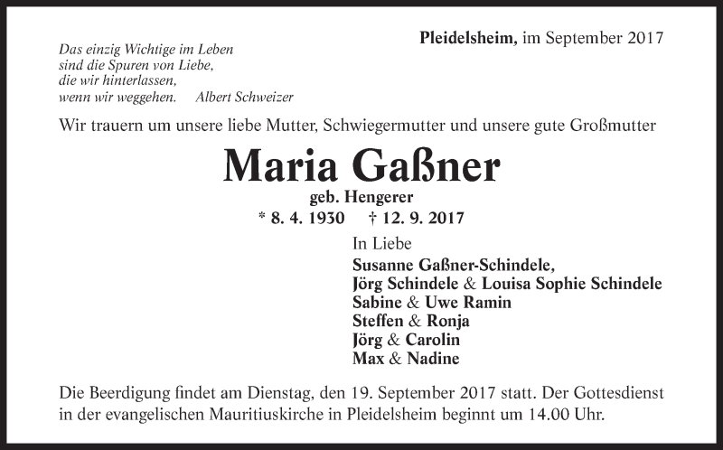 Hier finden Sie alle Traueranzeigen aus der Zeitung, die bisher für Maria Gaßner erschienen sind. Weitere Traueranzeigen, die in der Zeitung erscheinen, werden hier ebenfalls aufgelistet