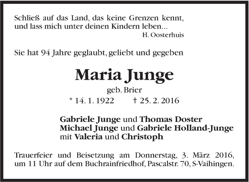 Hier finden Sie alle Traueranzeigen aus der Zeitung, die bisher für Maria Junge erschienen sind. Weitere Traueranzeigen, die in der Zeitung erscheinen, werden hier ebenfalls aufgelistet