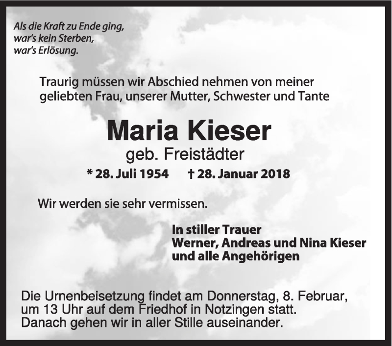 Hier finden Sie alle Traueranzeigen aus der Zeitung, die bisher für Maria Kieser erschienen sind. Weitere Traueranzeigen, die in der Zeitung erscheinen, werden hier ebenfalls aufgelistet