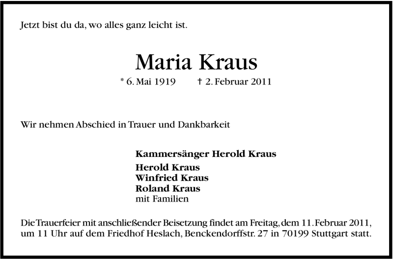 Hier finden Sie alle Traueranzeigen aus der Zeitung, die bisher für Maria Kraus erschienen sind. Weitere Traueranzeigen, die in der Zeitung erscheinen, werden hier ebenfalls aufgelistet