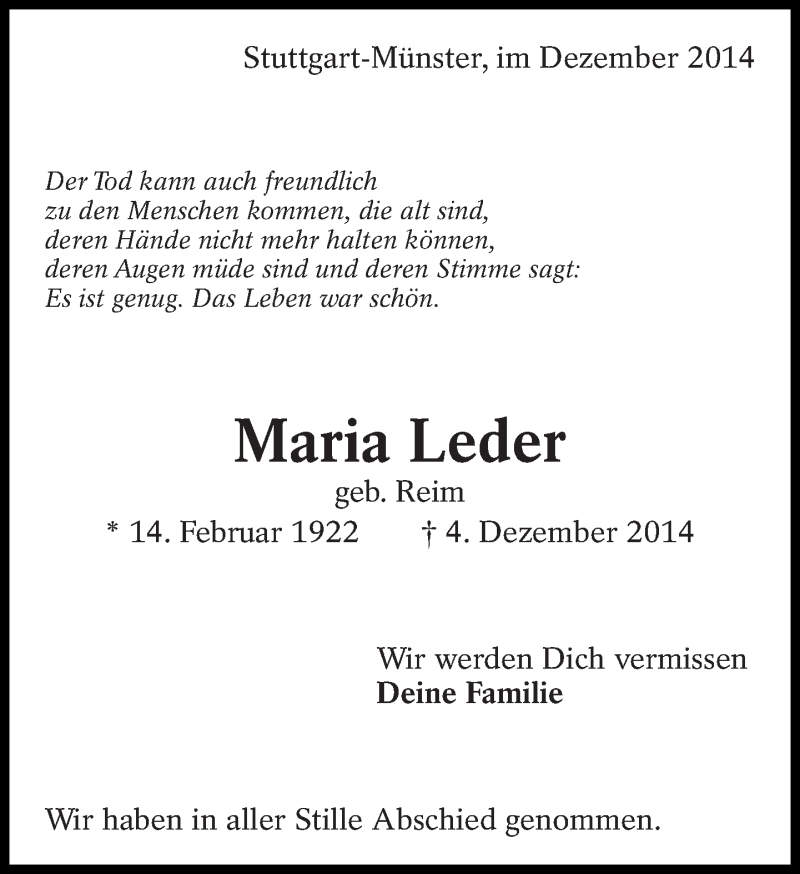 Hier finden Sie alle Traueranzeigen aus der Zeitung, die bisher für Maria Leder erschienen sind. Weitere Traueranzeigen, die in der Zeitung erscheinen, werden hier ebenfalls aufgelistet