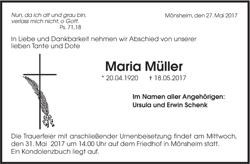 Hier finden Sie alle Traueranzeigen aus der Zeitung, die bisher für Maria Müller erschienen sind. Weitere Traueranzeigen, die in der Zeitung erscheinen, werden hier ebenfalls aufgelistet