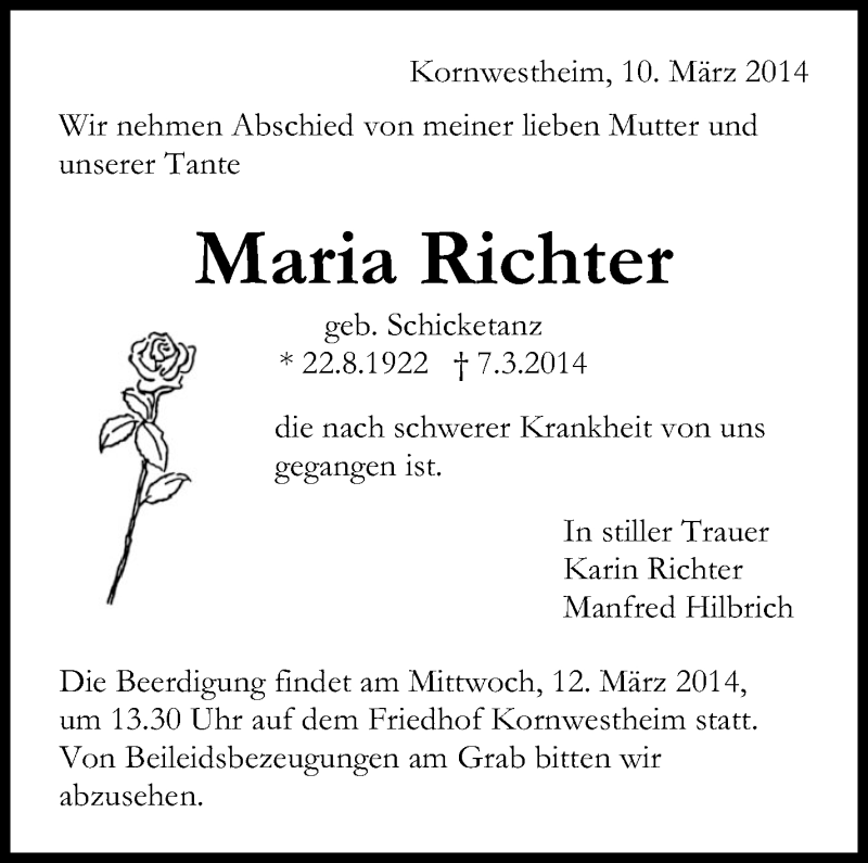 Hier finden Sie alle Traueranzeigen aus der Zeitung, die bisher für Maria Richter erschienen sind. Weitere Traueranzeigen, die in der Zeitung erscheinen, werden hier ebenfalls aufgelistet
