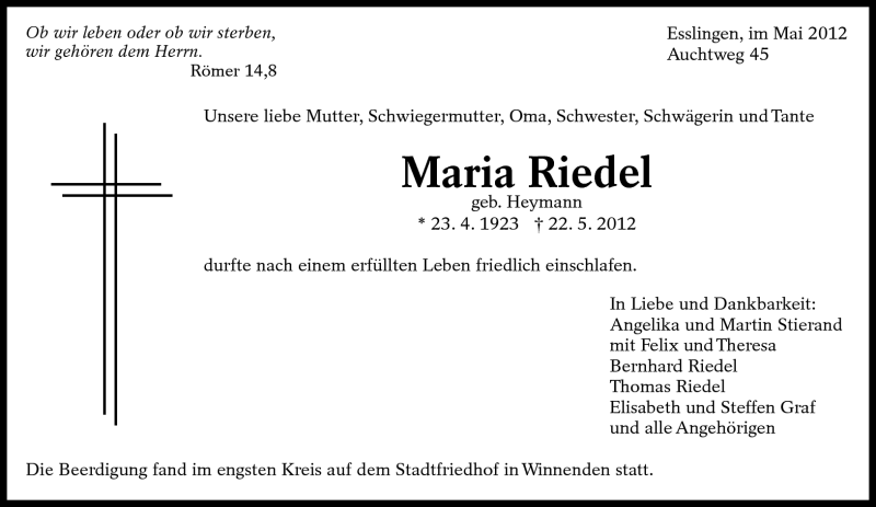 Hier finden Sie alle Traueranzeigen aus der Zeitung, die bisher für Maria Riedel erschienen sind. Weitere Traueranzeigen, die in der Zeitung erscheinen, werden hier ebenfalls aufgelistet