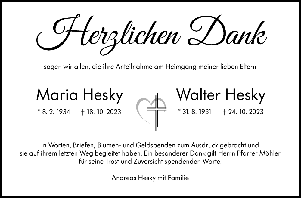 Hier finden Sie alle Traueranzeigen aus der Zeitung, die bisher für Maria und Walter Hesky erschienen sind. Weitere Traueranzeigen, die in der Zeitung erscheinen, werden hier ebenfalls aufgelistet