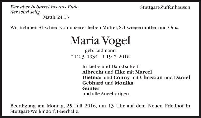 Hier finden Sie alle Traueranzeigen aus der Zeitung, die bisher für Maria Vogel erschienen sind. Weitere Traueranzeigen, die in der Zeitung erscheinen, werden hier ebenfalls aufgelistet