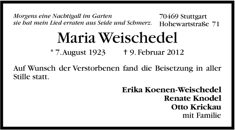 Hier finden Sie alle Traueranzeigen aus der Zeitung, die bisher für Maria Weischedel erschienen sind. Weitere Traueranzeigen, die in der Zeitung erscheinen, werden hier ebenfalls aufgelistet