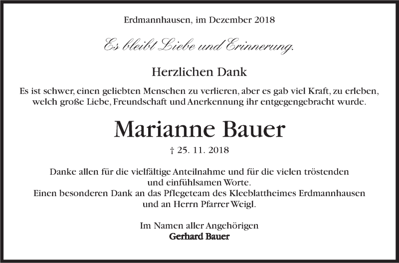 Hier finden Sie alle Traueranzeigen aus der Zeitung, die bisher für Marianne Bauer erschienen sind. Weitere Traueranzeigen, die in der Zeitung erscheinen, werden hier ebenfalls aufgelistet