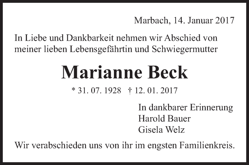 Hier finden Sie alle Traueranzeigen aus der Zeitung, die bisher für Marianne Beck erschienen sind. Weitere Traueranzeigen, die in der Zeitung erscheinen, werden hier ebenfalls aufgelistet