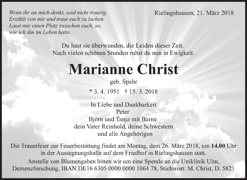 Hier finden Sie alle Traueranzeigen aus der Zeitung, die bisher für Marianne Christ erschienen sind. Weitere Traueranzeigen, die in der Zeitung erscheinen, werden hier ebenfalls aufgelistet