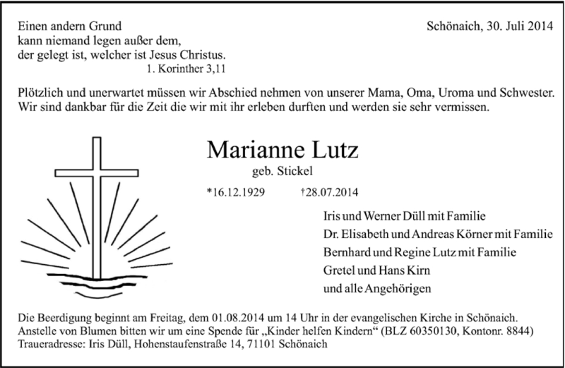Hier finden Sie alle Traueranzeigen aus der Zeitung, die bisher für Marianne Lutz erschienen sind. Weitere Traueranzeigen, die in der Zeitung erscheinen, werden hier ebenfalls aufgelistet